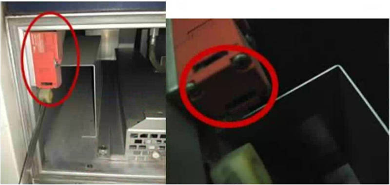 4、此时,可能是灯箱门锁开关故障导致的,此时我们打开灯箱门,然后可以看到左侧的一个红色模块,即门锁开关,我们可以松开门锁开关下面的四个螺钉,直到M2报警信息消除,这样我们就可以让门锁开关故障,进行下一次测试,但如果M2无法消除,这表明门锁开关可能损坏,需要更换。